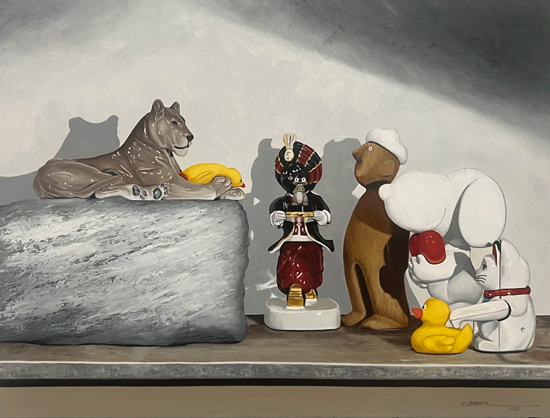 Gliederpuppe mit Eisbär und Winkekatze, Öl auf Holz, 50 x 60 cm, 2024