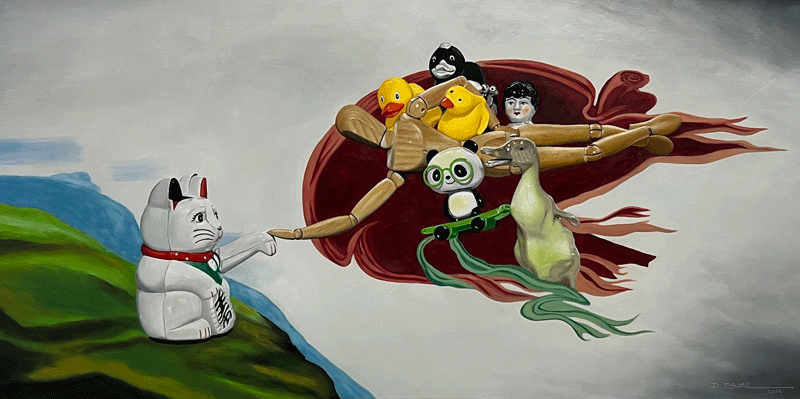 Die Erschaffung der Winkekatze, Öl auf Holz, 50 x 100 cm, 2026